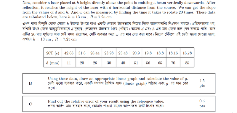 (B) Using these data, draw an appropriate linear graph and calculate the value of g.