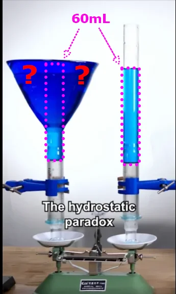The left side of the scale only feels the weight of the column above the lower "tail" of the funnel (i.e. 60mL).
