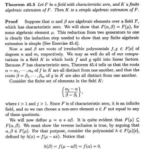 "If ##E## is an extension field of a field ##F## and ##\alpha \in E## is a root of a polynomial in ##F[x]##, we say ##\alpha## is algebraic over ##F##. ...)
