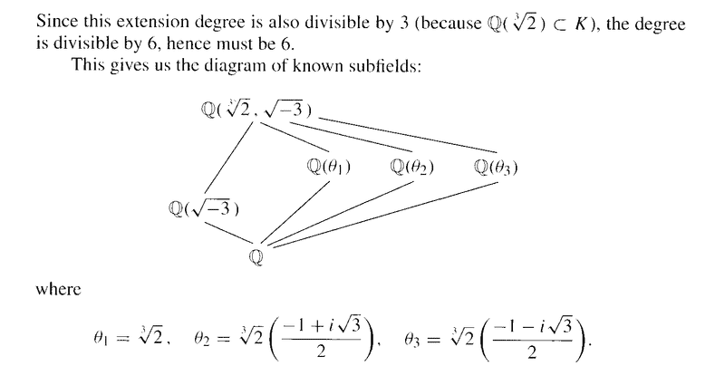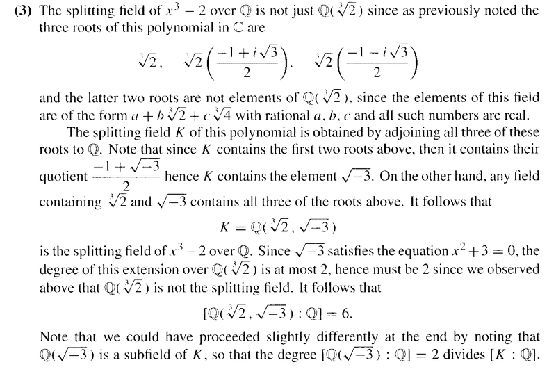 " ... ... Since ##\sqrt{ -3 }## satisfies the equation ##x^2 + 3 = 0## the degree of this extension over ##\mathbb{Q} ( \sqrt [3] {2} )## is at most ##2##, hence must be ##2## since we observed above that ##\mathbb{Q} ( \sqrt [3] {2} )## is not the splitting field ... ... "I do not understand why the degree of the extension ##K## over ##\mathbb{Q} ( \sqrt [3] {2} )## must be exactly ##2## ... ... why does ##\mathbb{Q} ( \sqrt [3] {2} )## not being the splitting field ensure this ... ...