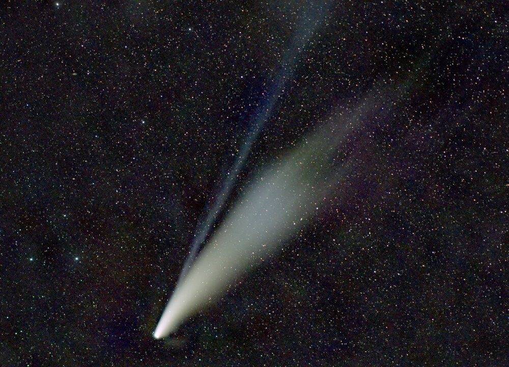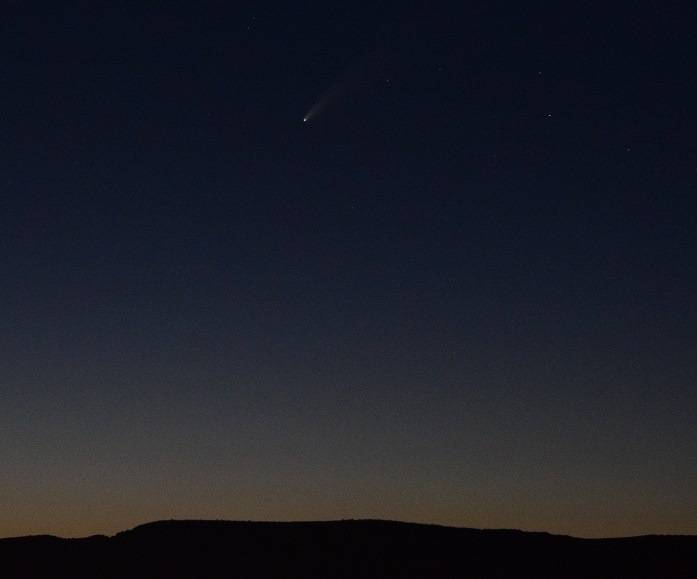 When I finished, I came in through my back deck door, noticed my 10x50s binoculars sitting by the door, and thought "I should take these into backyarrd and see if there is a break in the clouds to the north." There was! I easily spotted Capella, looked left, and immediately saw comet NEOWISE with my naked eyes from a city of 80000. This was first sighting of comet NEOWISE, as I've had clouds, clouds, clouds. Put my binocularrs up, and was floored by the sight!