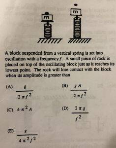 The discussion revolves around a problem involving a spring and a rock, focusing on the conditions under which the rock separates from the spring during oscillation. The subject area includes concepts from mechanics, specifically relating to forces, acceleration, and simple harmonic motion.
