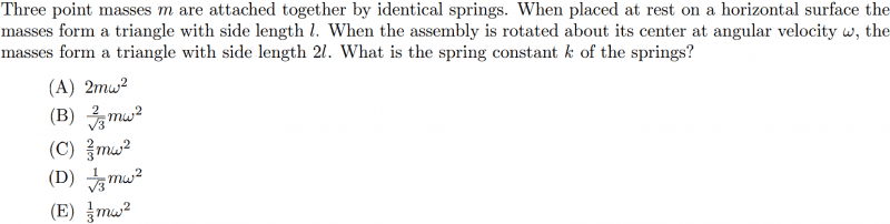 This discussion revolves around a problem involving spring forces and angular momentum, specifically focusing on the conservation of energy in a system with multiple masses connected by springs. The participants are exploring the relationships between potential energy in springs and kinetic energy in rotational motion.