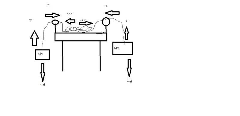 Draw a picture of a spring connected over pulleys to two hanging objects of equal