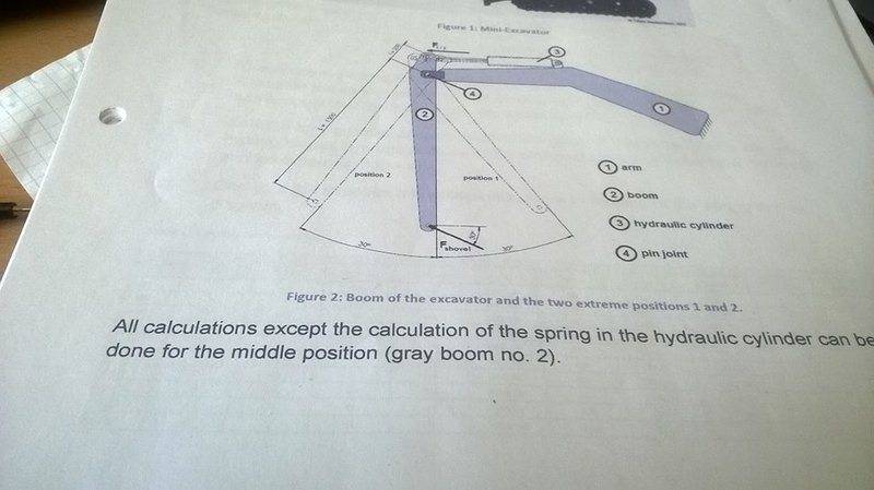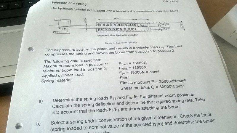 1. A hydraulic cylinder equipped with a helical coil compression spring(figure is attached). The oil pressure acts the spring and moves the boom from position 1 to position 2.