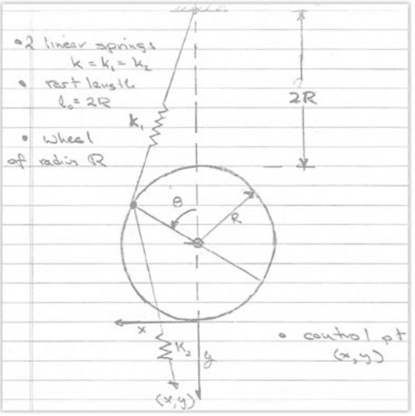 The picture is too tough to draw online, so I've attached a picture of it. The illustrated mechanism shows two springs both with a known spring constant ##k## and rest length of ##2R##. One end of the top spring is fixed above a wheel and the other end is attached to the wheel that may rotate but not move. The other spring also has one end attached to the wheel, while the other end of this spring is at some user-selected distance ##(x,y)##.