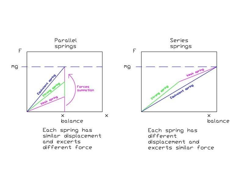 - Participants are attempting to analyze the forces acting on each spring and how they relate to the overall system. Questions about the interpretation of forces, the concept of effective spring constants, and the relationship between displacements in series versus parallel configurations are raised.
