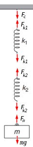 The discussion revolves around understanding the behavior of springs connected in series, particularly focusing on the forces and displacements involved when a mass is suspended from them. Participants are exploring the concepts of force interaction, effective spring constants, and the application of Newton's laws in this context.