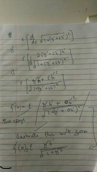 - There is a discussion about the implications of setting \( \epsilon = 0 \) and the presence of \( e \) multiplying the second term in equation 2, with one participant explaining that the \( \epsilon h \) in the denominator is set to zero when taking \( f'(0) \).