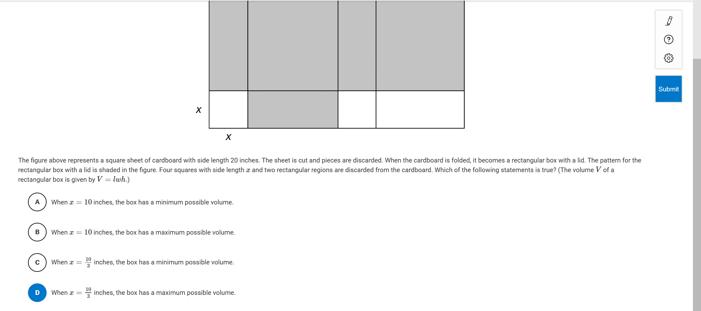 • Some participants calculate the derivative of the volume function, V', and identify critical points where V' = 0, specifically x = 10 and x = 10/3.