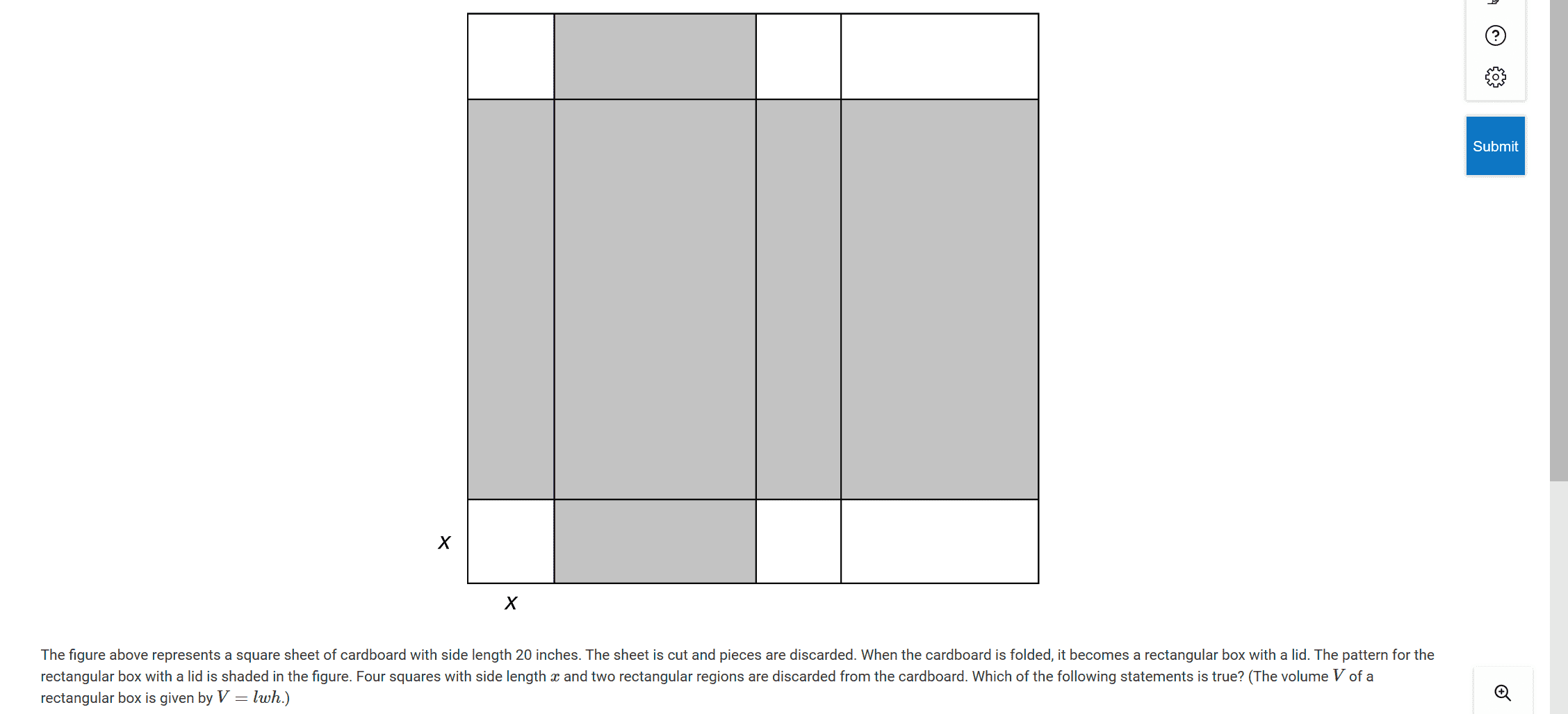 • There is a proposal to find the volume V as a function of x, leading to the equation V = 2x^3 - 40x^2 + 200x.