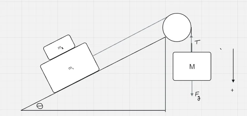 - Consider the diagram given. All surfaces have friction (u(s) & u(k)). When the system is released from rest, the mass M is heavy enough to pull m1 and m2 up the slope. m2 remains at rest with respect to m1. Determine the acceleration of the system in terms of the given variables