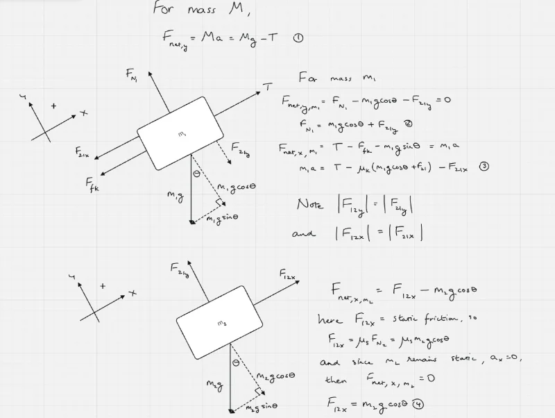 My doubt lies in the formulation of equation 4 - the force equation for the stacked block. Since we don't know the acceleration of the masses and we don't know if mass M is heavy enough to cause m2 to slide, do we leave [itex]F_{12x}[/itex] undetermined and not equate this to [itex]\mu_{s} F_{N}[/itex] ?