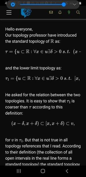 for ##v## in ##\tau_{1}##. But that is not true in all topology references that I read. According to their definition (the collection of all open intervals in the real line forms a standard topology) the standard topology is coarser than lower limit topology.