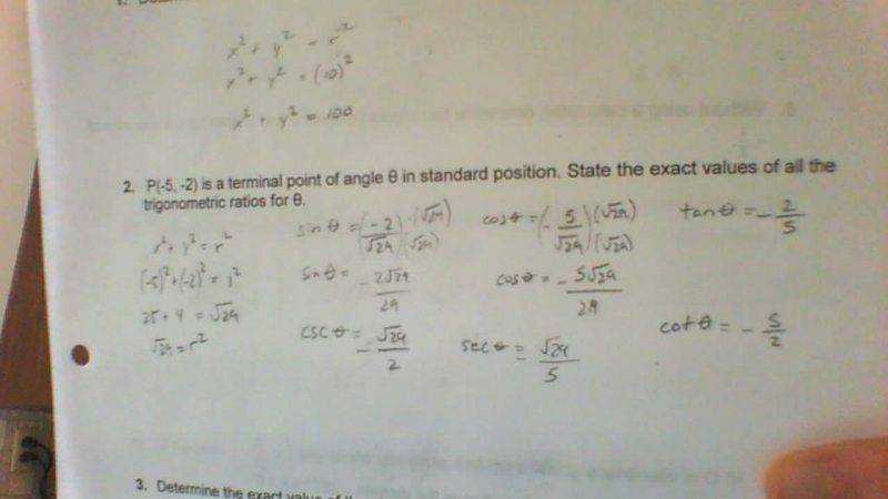The discussion revolves around determining the exact values of trigonometric ratios for an angle theta, given a terminal point P(-5,-2) in standard position. The context involves understanding the relationships between the coordinates and the trigonometric functions.
