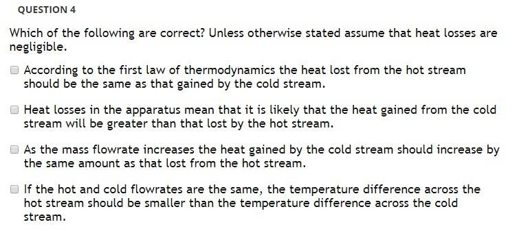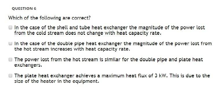 We did an experiment using 3 types of heat exchangers this week, double-pipe, shell in tube and plate type. Water was flowing in the HEs, the temperature was set. We had to change the flow-rate only. After the experiment, we were given lots of online question. Some of them are very tricky and I am not really sure which one is the correct one. The questions are the following: