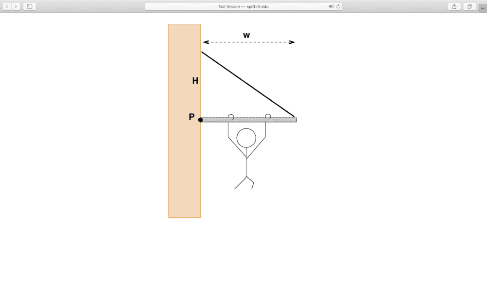 - A bar of width w = 3 m and mass m = 8 kg is attached to a wall by a hinge at P. A steel wire of radius r = 0.51464 mm runs from the end of the bar to the wall, attaching to the wall a distance H = 2 m above the point P.