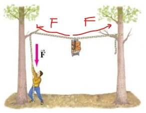 - The two trees shown in the figure are 6.6 m apart. A back-packer is trying to lift his pack out of the reach of bears. Calculate the magnitude of the force F that he must exert downward to hold a 19-kg backpack so that the rope sags at its midpoint by (a) 1.5 m, (b) 0.15 m.
