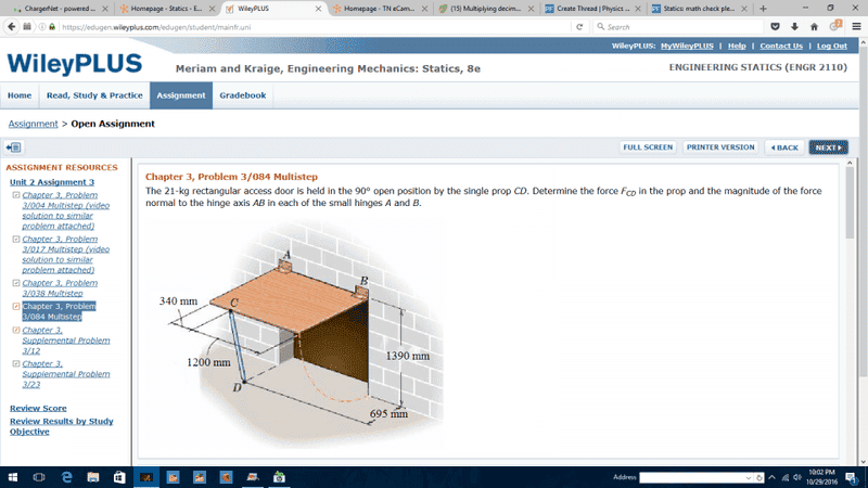The 25-kg rectangular access door is held in the 90° open position by the single prop CD. Determine the force F in the prop and the magnitude of the force normal to the hinge axis AB in each of the small hinges A and B.[/B]