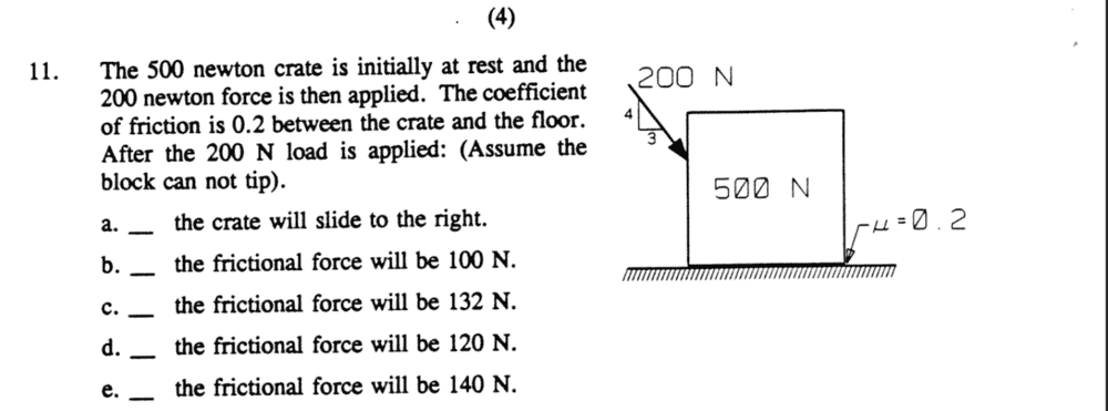 Answer key say answer is d. I took combined weight and vertical component of 200 force to calculate frictional force would be 132 N. Am I missing something?