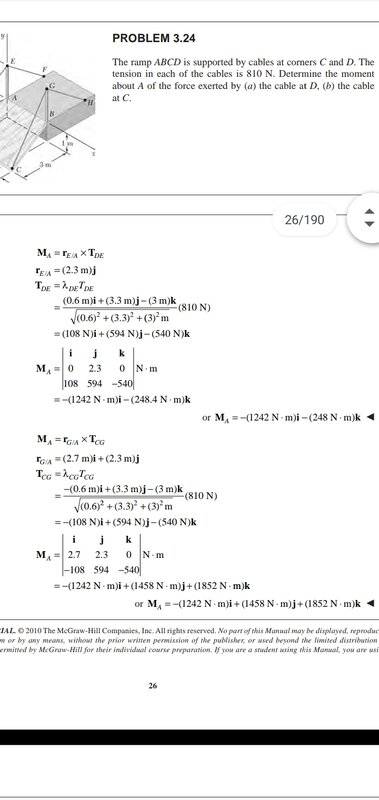 The discussion revolves around a statics problem involving a ramp supported by two cables, specifically focusing on the calculation of moments about different points (A and C). Participants explore the correct application of formulas and the implications of using different points of reference in their calculations.