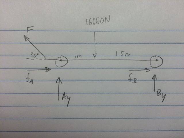 I tried the same approach for this problem. Summed the moments about A to find the reaction at B, and summed the forces in the Y-direction to find the reaction at A. I then multiplied those by the coefficient of friction to find their respective frictional forces. Then I summed the forces in the X-direction to solve for F. Wrong.