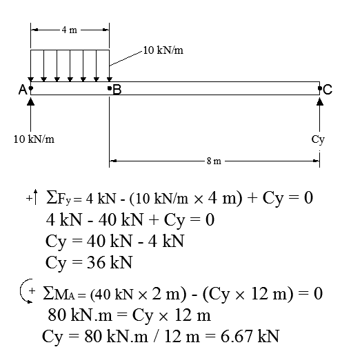 The discussion centers on the analysis of forces acting on a supported beam, specifically the calculation of the vertical reaction forces at supports A and C. The user questions the origin of a 4kN force and the discrepancies in the calculated values of Cy. It is concluded that the beam is in equilibrium with no net vertical force or moment, and that the reaction at support A must exceed that at support C due to an off-center load. The provided values for reactions at A (10kN or 4kN) are deemed incorrect based on the analysis of a 40kN point load located 2 meters from A.