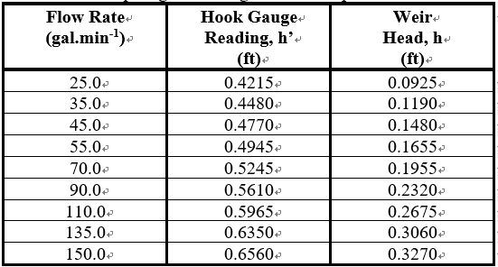- For the task, I was given a flow rate equation Q= kL(h^n), where k is a constant and L (width of rectangular weir) was set to 0.625 ft. A table with Q values and corresponding h' and h values was provided, please refer to the picture attached. h in the equation= h'-h in the table.