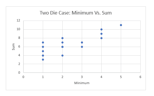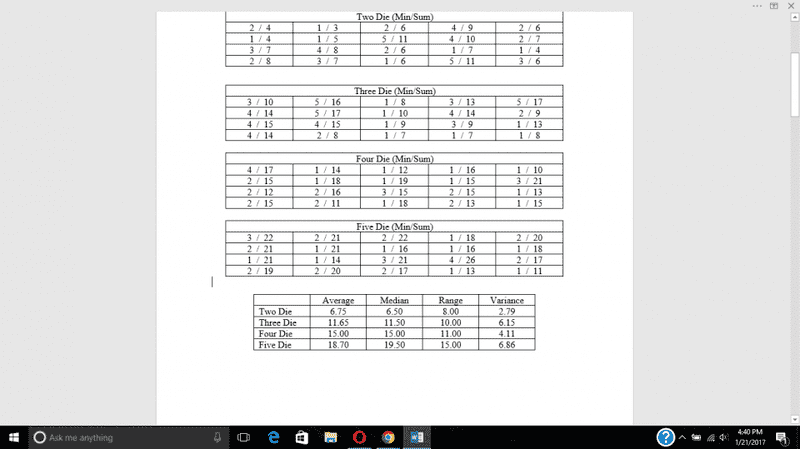 The discussion revolves around analyzing data generated from a dice experiment where participants rolled multiple dice and recorded the minimum value and the sum of the rolls. The focus is on identifying potential patterns in the calculated statistics (average, median, range, variance) and the relationship between the minimum value and the sum when plotted graphically. The scope includes exploratory reasoning and statistical analysis.