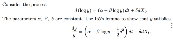 - Another participant provides a derivation involving a process defined by $dY_t = \mu_t dt + \sigma_t\, dX_t$, applying Ito's Lemma to a function $g(u) = e^u$ where $u = \log y$.
