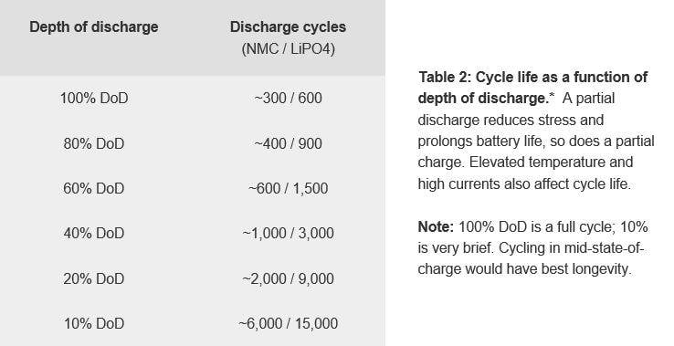 However if you recharge at lunchtime as well your average DoD will only be 40% and your battery will live for 3000 cycles. However you would be doing two cycles a day instead of one so that works out at 3000/2 = 1500 days.