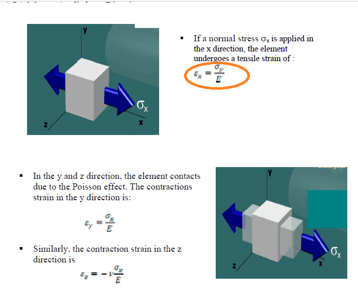 The discussion centers on the understanding of tensile forces applied to a cube and their effects on strain in different directions. The correct formula for strain in the x direction is confirmed as εx = σx / E, where σx represents the normal stress in the x direction and E is the modulus of elasticity. The participant expresses frustration with the textbook used, citing multiple typos in the equations presented, which undermines the learning process. This highlights the importance of using accurate resources for studying material properties and mechanics.