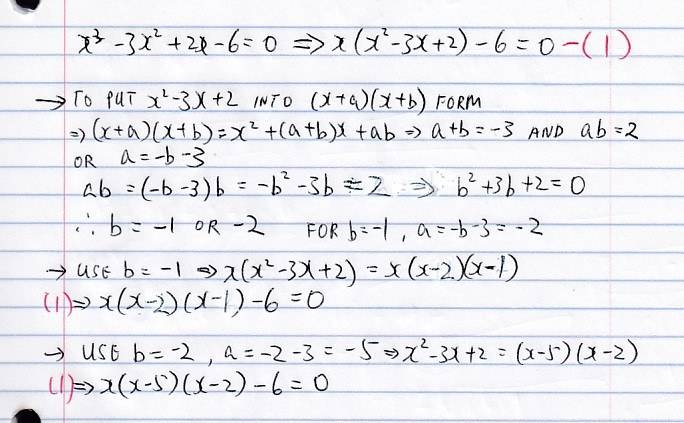 I.e. if r is a root of the quadratic t^2 - qt + (p^3/27), set u = cuberoot(r) and v = p/3u, and then u + v = X solves the cubic!Unfortunately, it seems the given problem is not well suited to this method, but she might enjoy using it on #14 and #15 given here. Of course, the first step of Euler's method, substituting Y = X-1, or X = Y-1, and expanding yields the simpler equation Y^3 - Y -6 = 0, whose solutions are each one less than the solutions of the original equation, and 2 is an obvious solution here, but the other solutions are solutions of the quadratic Y^2 + 2Y + 3. A moral is perhaps that Cardano's formula is not always that useful, in comparison to the rational root theorem.