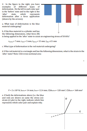 The discussion focuses on the concepts of stress and strain in relation to material deformations. Key points include the identification of elongation, compression, and the application of axial stress formulas. Participants express uncertainty regarding specific parts of the problem, particularly parts b and d, while confirming their understanding of compression in part c. The use of relevant equations for axial stress is emphasized as crucial for solving the problems presented.