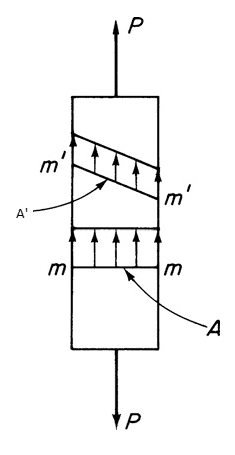by P/A, while on the inclined plane mm the stress is of magnitude P/A'. In both cases