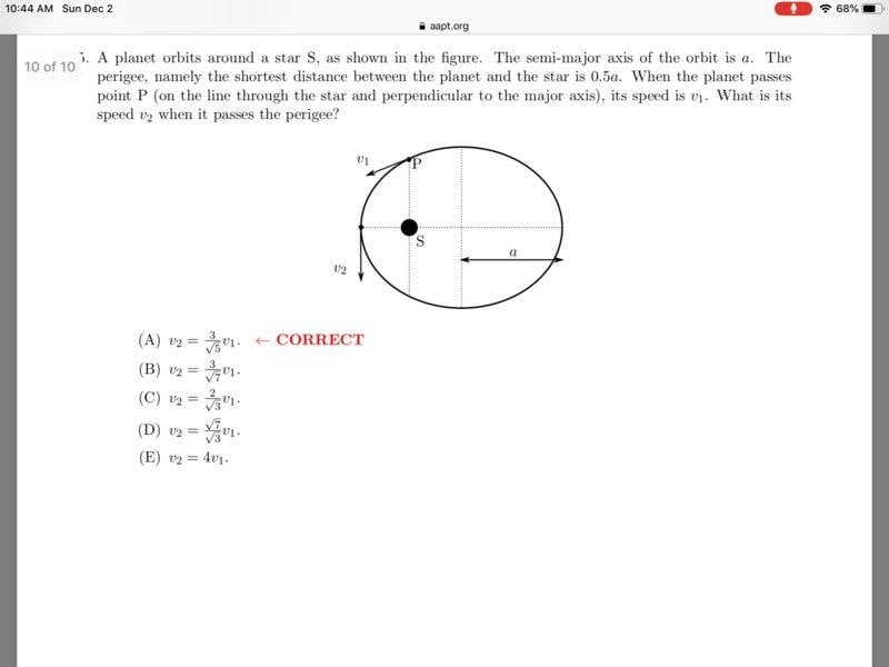 Edit: You're making some calculation error. Taking 0.75a for the semilatus rectum, you can show using conservation of momentum in a fairly straightforward way that ##v_2 = (3/\sqrt{5})v_1##.