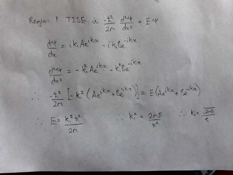 - Participants discuss the relationship between wave numbers in different regions and the implications of boundary conditions. There are questions about the equality of wave numbers and the conditions imposed by Schrödinger's equation.
