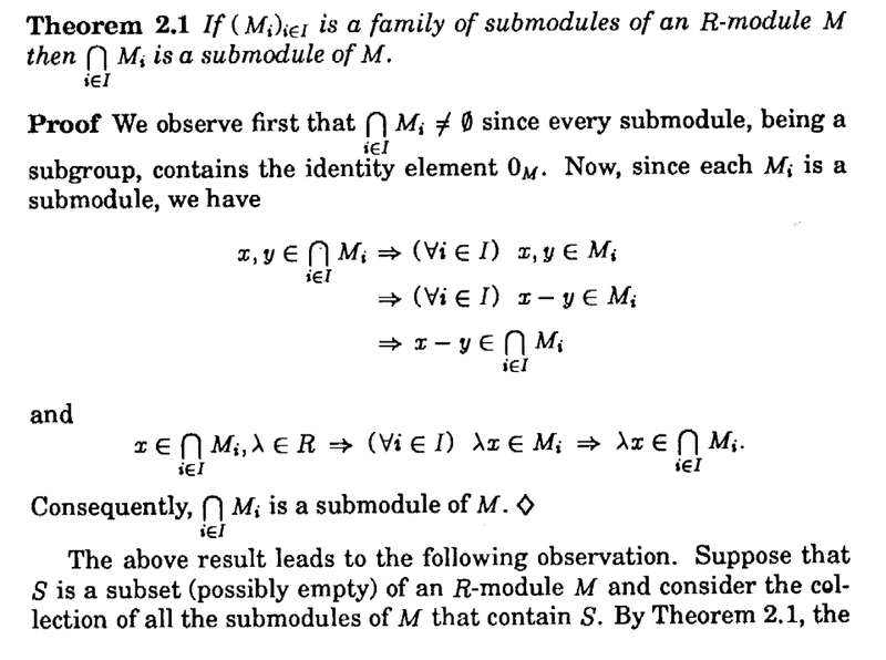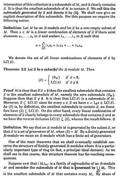 " ... ... then the submodule generated by ##\bigcup_{ i \in I } M_i## consists of all finite sums of the form ##\sum_{ j \in J } m_j## ... ... "The above statement seems to assume we take one element from each ##M_j## in forming the sum ##\sum_{ j \in J } m_j## ... ... but how do we know a linear combination does not take more than one element from a particular ##M_j##, say ##M_{ j_0 }## ... ... or indeed all elements from one particular ##M_j## ... rather than one element from each submodule in the family ##\{ M_i \}_{ i \in I}## ...