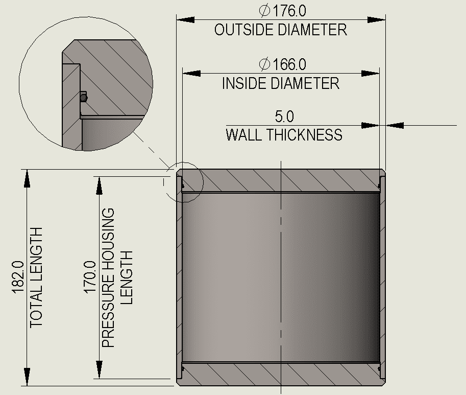 I’m designing a subsea sensor that will go to a max depth of 600 m (6 MPa/60 bar). In a simple model, it will be made of a pressure housing cylinder and two end caps, all grade 5 titanium. Some geometry is attached.