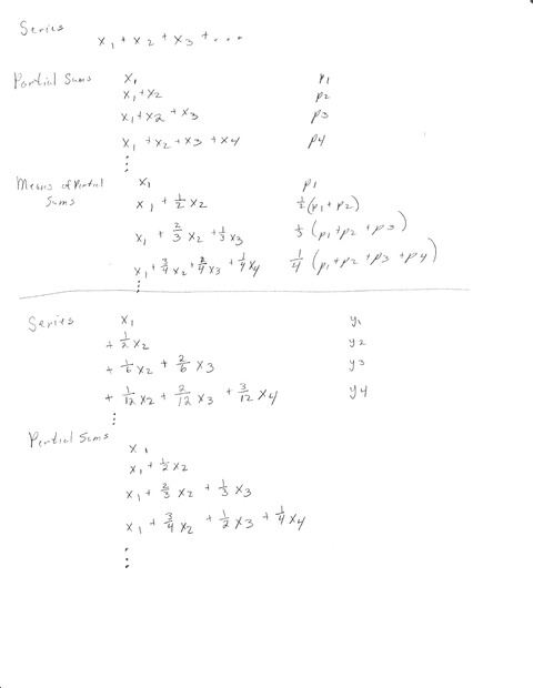 Using the given rule for the ##x_n##, write $$ \sum_l y_l = x_1 + \frac{1}{2} x_2 + \frac{1}{6} x_2 + \frac{1}{3} x_3 + \frac{1}{12} x_2 + \frac{1}{12} x_3 + \frac{1}{20} x_2 + \cdots + \frac{1}{n} x_n $$
