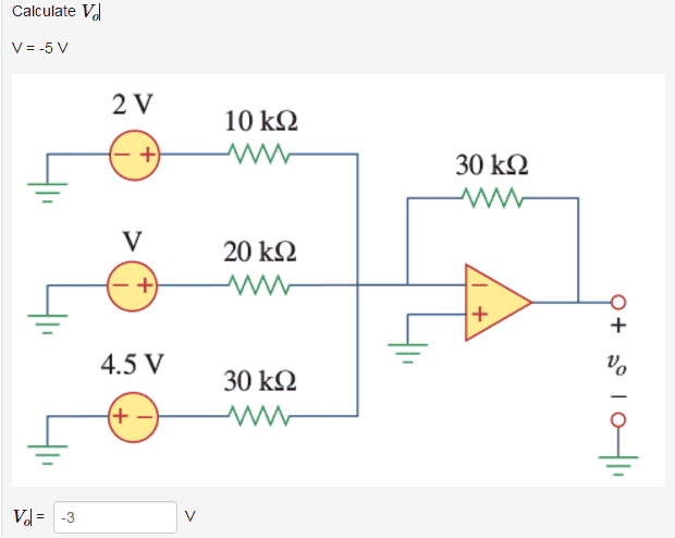 The discussion revolves around troubleshooting a summing op amp circuit where the input voltage is specified as -5V. Participants are examining the calculations related to the output voltage, which has been reported as -3V by the original poster.