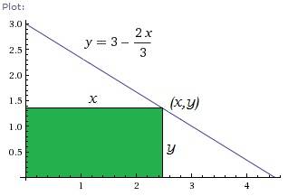 1) A rectangle is constructed so that one vertex is at the origin, and another vertex is on the graph of y=3 - 2x/3 where x >0 and y>0 and adjacent sides are on the axes. what is the maximum possible area of the rectangle?