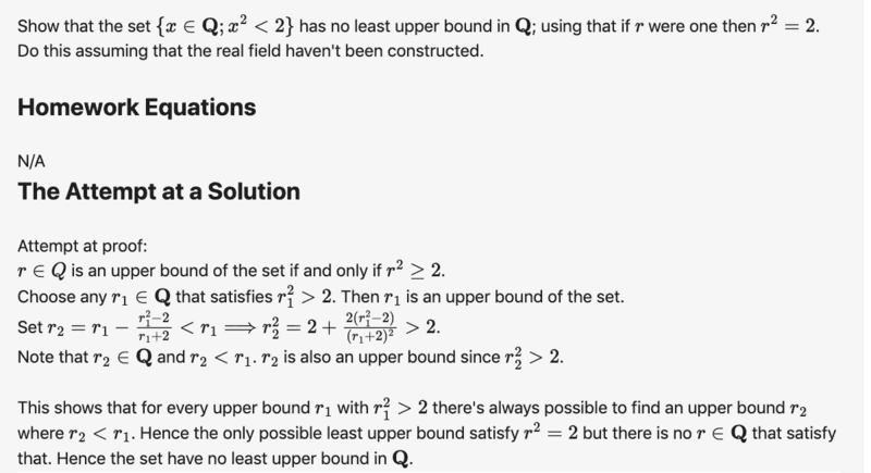 That question makes no sense.lys04 said:Ok so you’re supposing s is the supremum of S, which when squared should be a number that is extremely close to 2, but not exactly since there is no sqrt 2 in Q.
