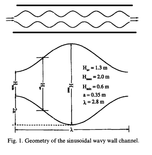 I will be passing a Newtonian fluid. Unfortunately I can not give the main reason behind this experiment, I need to apply different roughness values by adjusting the magnitudes of length and height of the amplitudes. 2a is comparable to Hmin. I will upload a better picture tomorrow, since all of my work is saved in my office's PC. Regardless, 2a can be adjusted to equal Hmin. The distance between plates is subject to change in order to see how will that will effect the fluid. I did fluid mechanics in my undergrad, correct me if I am wrong, but the moody diagram helps establish the friction factor. That is something I will consider later in my project. However, like I previously mentioned, I am wanted to know if there an equation, or through the use of integration, that I can quantify roughness based on the topography of the pipe. Finally, the dimension prependicular to the paper is comparable to 2a.