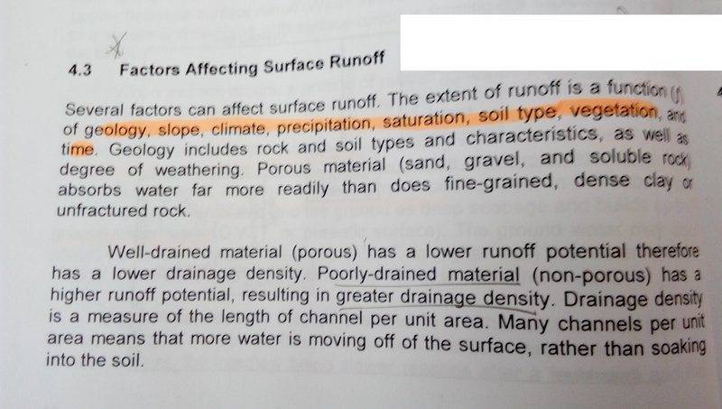 - Another participant supports this distinction by explaining that well-drained surfaces absorb water, resulting in lower runoff potential and drainage density, while poorly-drained surfaces lead to higher runoff potential and drainage density.