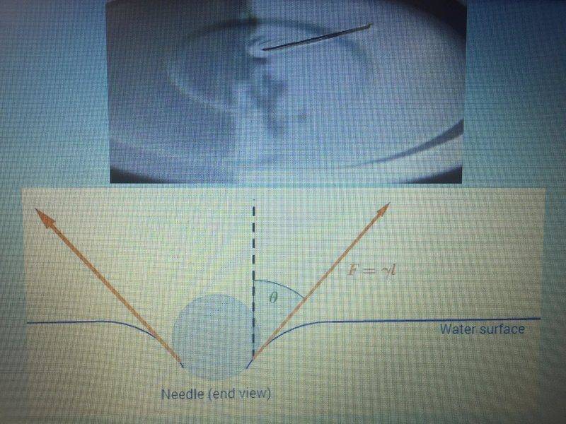 When a needle is gently placed on the surface of still water (γ = 0.0730 N.m-1) it can be supported by surface tension if the mass of the needle is small enough.