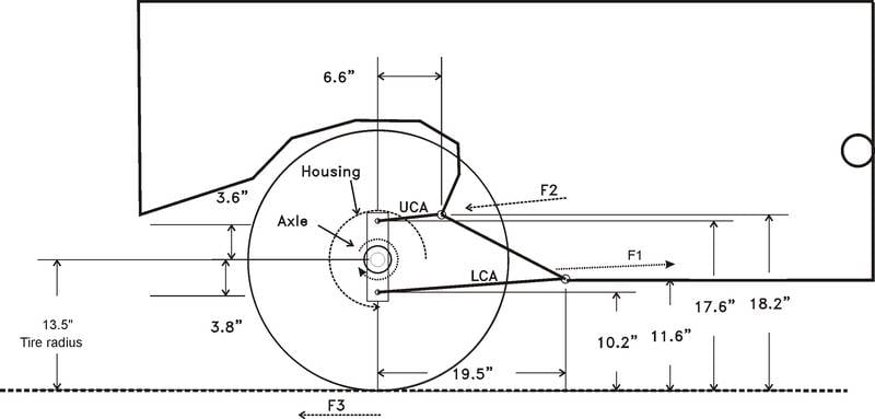 My problem is understanding arm angles and how they affect the body. I'd like the rear axle to push on or slightly below the center of gravity so the car does not roll up in the front, barely lifting the front wheels so all weight sits on the back tires. If I could understand the forces I could reason through this.