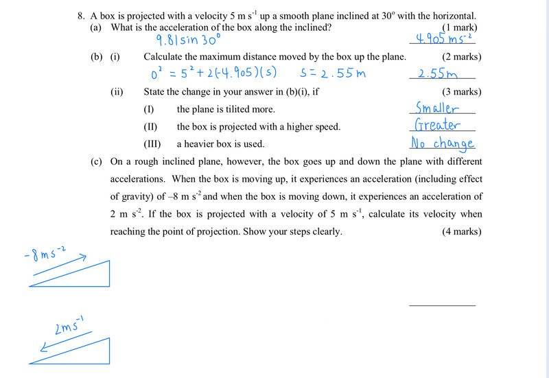 I expect the exercise composer means ##5## m/s along the incline, not ##5## m/s in a horizontal diertion.dorothy said:Before that, I want to ask whether I understand question8 correctly? Is it true that there is a guy throwing(projecting) a box horizontally and the box finally land on the inclined plane(like what I have drawn)? Thank you.