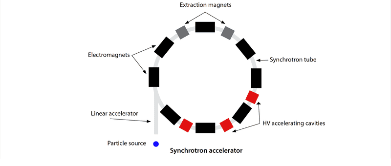 a) Synchrotron accelerators take in particles, which are fired into them by linear accelerators such as protons. The particles rotate in a circular motion (caused by a electromagnets), which uses oppositely charged accelerating cavities to increase the acceleration of the particles. The magnets are set up in a circular pattern and in between them are accelerating cavities. In order to counter the effects of accelerating particles, the strength of the magnetic field is increased. Since the circular accelerators are large, energy is constantly added to the charged particles continuously moving around the circuit. The cavity behind the particle is similarly charged pushing the particle forward, and the cavity in front is oppositely charged pulling the particle forward. The overall goal is to accelerate the particles forward in their circular motion as fast as possible, which is close to the speed of light but never at the speed of light.