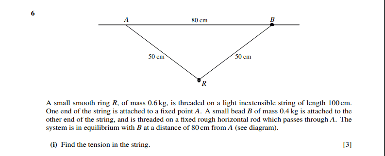 The discussion revolves around a system in equilibrium involving a ring and string tension. Participants are examining the forces acting on the ring, particularly questioning the absence of a normal force in the resolution of forces as indicated in a mark scheme.